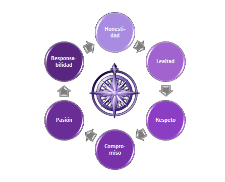 Honestidad, Lealtad, Respeto, Compromiso, Pasión , Responsabilidad.